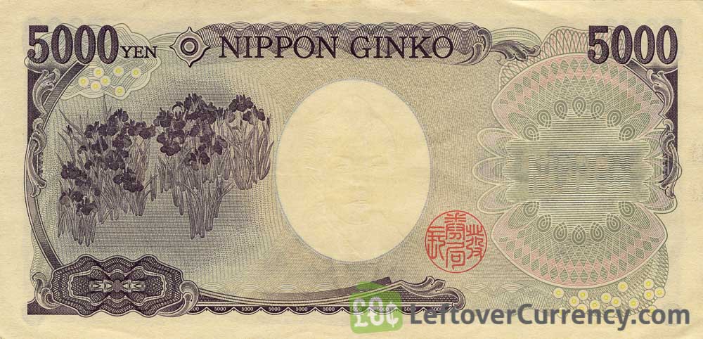 The banknote of five thousand yen features the image of Ichiyo Higuchi, Japanese novelist. The words ‘Nippon Gingko’ are printed on the paper note. The backside of the 5000 yen note shows ‘Irises’, a painting by Ogata Kōrin of the Rinpa school.