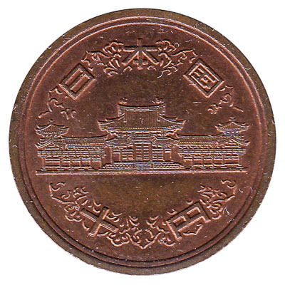 The Japanese bronze-brown-colored coin of 10 yen has a diameter of 23.5mm and weighs 4.5g. It features a temple and bay laurel leaves. Text on the bronze coin reads ‘Nippon’.