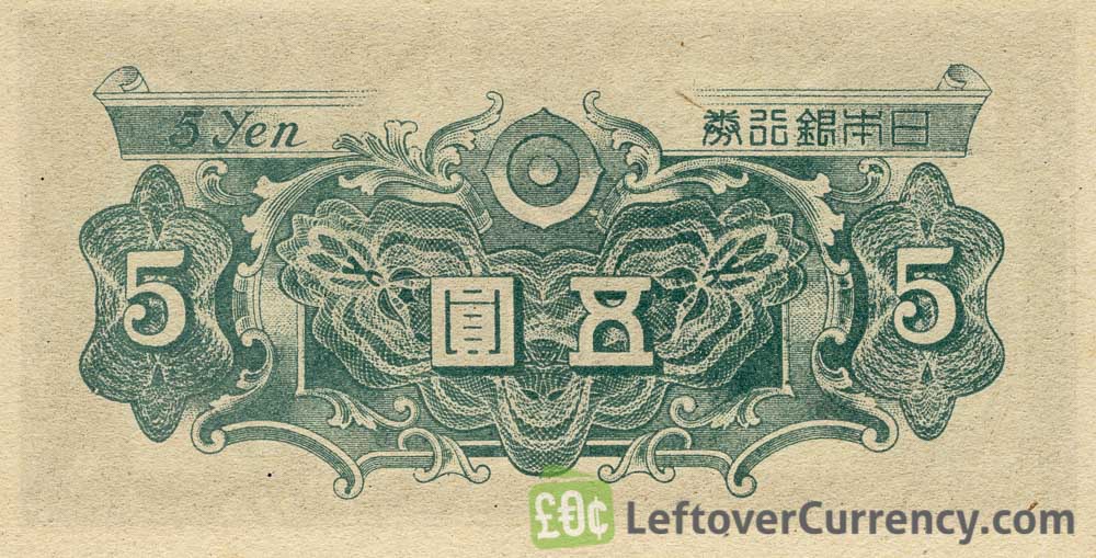 The Bank of Japan issued Japanese Yen banknotes in 11 different denominations, including this 5 Japanese Yen banknote (1946). They are part of the withdrawn Japanese Yen banknotes series. The Bank of Japan started issuing these 5 Japanese Yen banknotes in 1946. They were withdrawn from circulation in 1955.