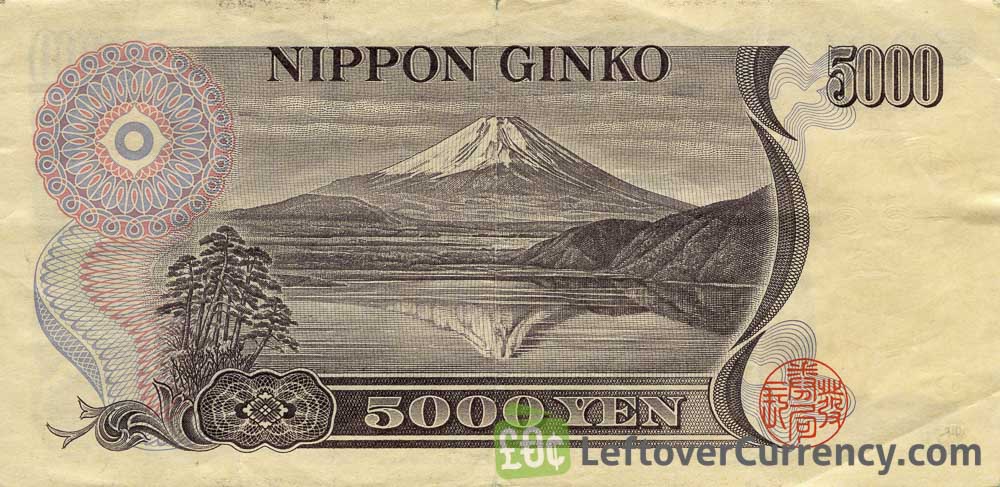 The banknote of 5000 yen depicts Inazo Nitobe, Japanese author. The paper note contains the words ‘Nippon Gingko’. The backside of the ¥5000 banknote features a lake and Mount Fuji.