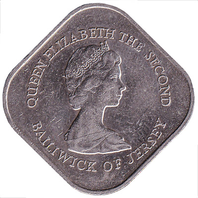 The States of Jersey issued Jersey Pound coins in 9 different denominations, including this 1 Jersey Pound coin (square). They are part of the Jersey Pound coins series. The States of Jersey started issuing these 1 Jersey Pound coins in 1981. They are currently still in circulation.
