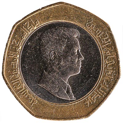 The highest value coin of the Hashemite Kingdom of Jordan is the half dinar coin. On the bimetallic 1/2 dinar piece is a floral design and the portrait of King Abdullah II of Jordan.