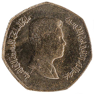 The Central Bank of Jordan issued Jordanian Dinar coins in 5 different denominations, including this Quarter Dinar coin Jordan. They are part of the Jordanian Dinar coins series. The Central Bank of Jordan started issuing these 0.25 Jordanian Dinar coins in 2004. They are currently still in circulation.