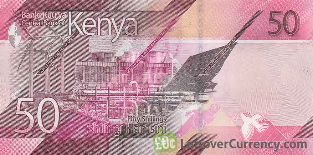 This banknote of 50 Kenyan Shillings features a statue of President Jomo Kenyatta alongside the Kenyatta International Convention Centre Tower on the obverse side. The reverse side of the 50 KES bill features Kenya’s green energy installations (wind power, geothermal power and solar power). The Central Bank of Kenya announced the new designs were also a celebration of the cultural values and natural resources of Kenya. Each banknote features a different aspect of this.
