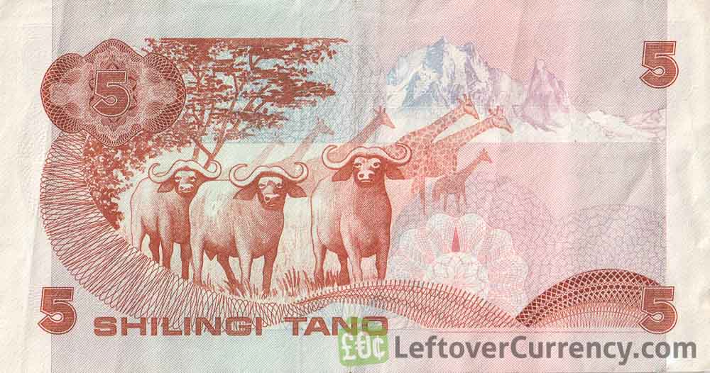 President Daniel Toroitich Arap Moi is featured on this 5 KES bill. The reverse side of the banknote features buffalos and giraffes in the African Savannah.