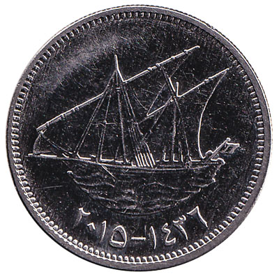 The coin of 50 fils is the equivalent of 0.05 Kuwaiti dinar. The copper clad steel coin weighs 4.51 grams and measures 23mm across.
