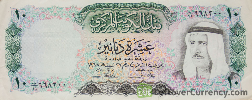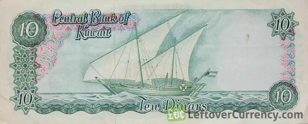 The 10 dinar banknote from Kuwait’s Second Issue shows a traditional sailing vessel at sea. The portrait on the old 2nd series 10 KWD bill is that of Sheikh Al-Sabah.