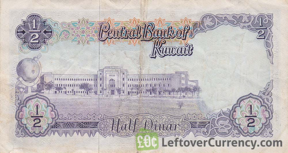 The main building of Kuwait University is shown on the reverse side of this banknote of half a dinar. The portrait of Sheik Sabah bin Salim al-Sabah is shown on the old 1/2 KWD bill’s obverse side.