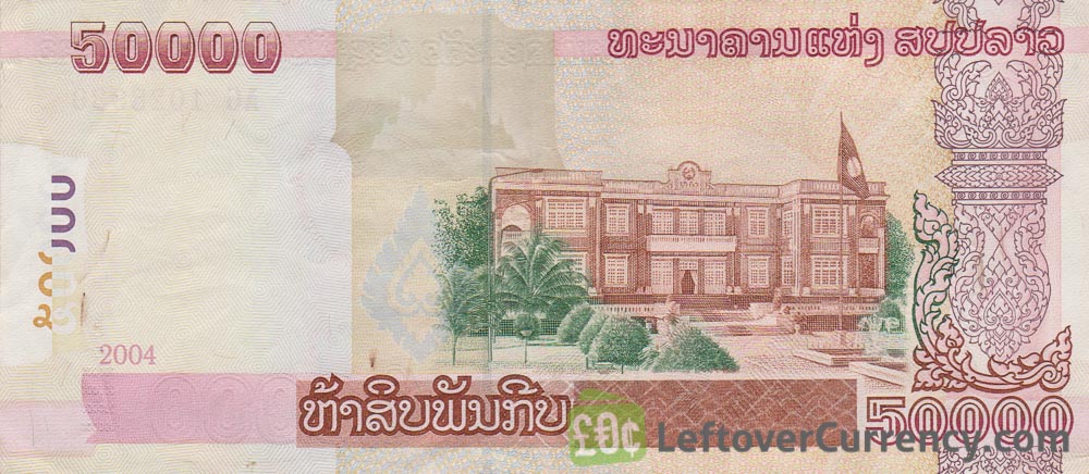 The Bank of the Lao P.D.R. issued Kip banknotes in 8 different denominations, including this 50,000 Lao Kip banknote. They are part of the current Lao Kip banknotes series. The Bank of the Lao P.D.R. started issuing these 50000 Kip banknotes in 2004. They are currently still in circulation.