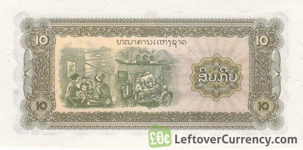 On the front side of the brown-coloured 10 Lao Kip banknote are workers at a lumber mil. The back side of the old ₭10 LAK bill shows scenes in a hospital including a patient undergoing surgery.