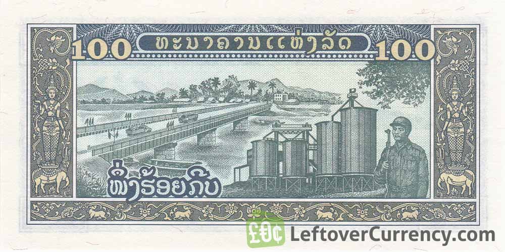 The green-coloured 100 Kip banknote from Laos shows farmers harvesting on the front side. In the background are the temples of Pha That Luang and Haw Phra Kaew in the Lao capital Vientiane. On the back side of the ₭100 LAK bill is an image of a bridge over the Mekong River next to a scene of industry and a soldier.