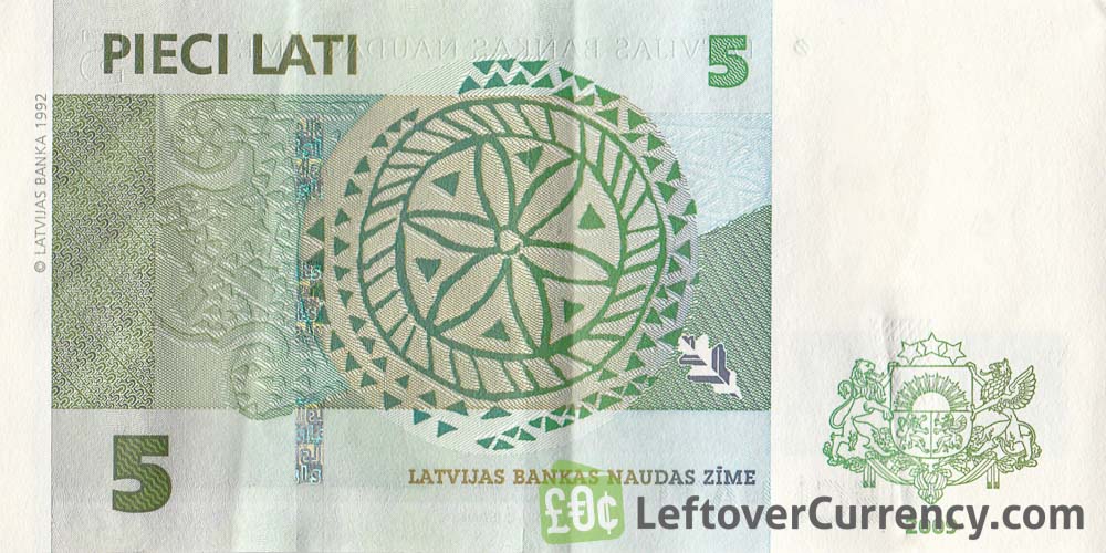 The Bank of Latvia issued Latvian Lats banknotes in 7 different denominations, including this 5 Latvian Lati banknote. They are part of the Latvian Lats banknotes series. The Bank of Latvia started issuing these 5 Latvian Lats banknotes in 1992. They were withdrawn from circulation in 2013.