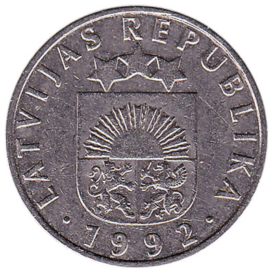 The Bank of Latvia issued Latvian Lats coins in 8 different denominations, including this 50 Santimu coin Latvia. They are part of the Latvian Lats coins series. The Bank of Latvia started issuing these 0.5 Latvian Lats coins in 1992. They were withdrawn from circulation in 2013.
