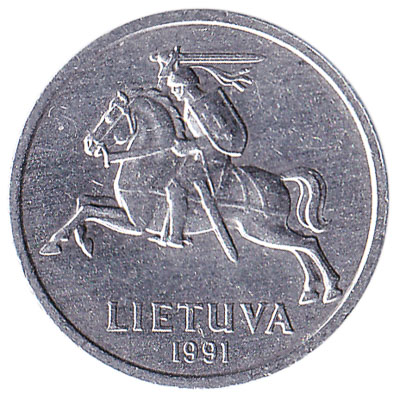 The Bank of Lithuania issued Lithuanian Litas coins in 9 different denominations, including this 1 Centas coin Lithuania. They are part of the Lithuanian Litas coins series. The Bank of Lithuania started issuing these 0.01 Lithuanian Litas coins in 1991. They were withdrawn from circulation in 1997.