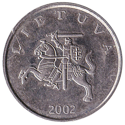 The Lithuanian one litas coin is a silver-coloured coin made of copper-nickel. Like other pre-Euro Lithuanian coins, it has the national coat of arms known as Vytis, a knight on horseback with sword and shield raised, together with the date of issue, on the obverse side, and the denomination on the reverse. The one litas coin weighs 6.25 grams and measures 22.3mm in diameter and has a thickness of 1.5mm.