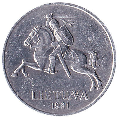 The Bank of Lithuania issued Lithuanian Litas coins in 9 different denominations, including this 2 Centai coin Lithuania. They are part of the Lithuanian Litas coins series. The Bank of Lithuania started issuing these 0.02 Lithuanian Litas coins in 1991. They were withdrawn from circulation in 1997.