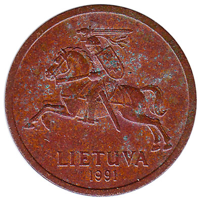 The bronze Lithuanian twenty centu coins were replaced by nickel-brass coins. These older bronze coins weigh 2.1 grams, and measure 17.5mm in dfiameter and have a thickness of 1.15mm. Vytis, the knight on horseback featured on the obverse side of the coin, is the Lithuanian national coat of arms.