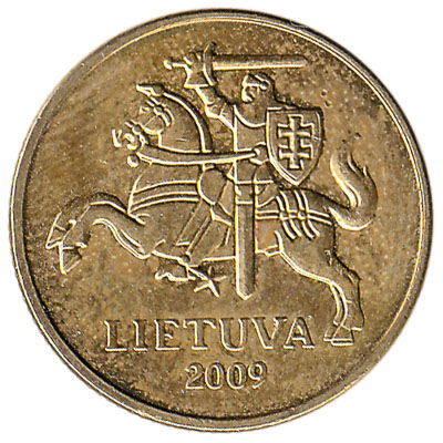 This stout nickel-brass twenty centu coin from Lithuania has a diameter of 20.5mm, a thickness of 2.1mm, and a weight of 4.8 grams. In common with other pre-Euro Lithuanian coins, it has the national coat of arms known as Vytis, a knight on horseback with sword and shield raised, together with the date of issue, on the obverse side, and the denomination on the reverse.