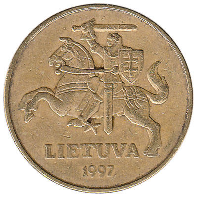 The fifty centu Lithuanian nickel-brass has the national coat of arms known as Vytis, a knight on horseback with sword and shield raised, together with the date of issue, on the obverse side, and the denomination on the reverse. It has a diameter of 23mm, a thickness of 2.1mm, and weighs 6 grams.