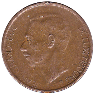 This aluminium-bronze 20 Luxembourg Francs coin features the portrait of Jean, Grand Duke of Luxembourg on the obverse side. Older versions of the 20F piece have two oak branches surrounding the crowned face value on the reverse side. On newer versions the reverse side has a simple design with just the face value under a crown and the word ‘LËTZEBUERG’. The abbreviation ‘IML’ means Institut Monetaire Luxembourgeois.