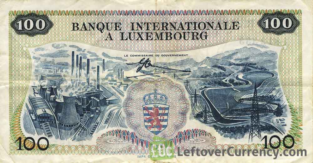 The Grand-Duché de Luxembourg issued Luxembourgish Franc banknotes in 5 different denominations, including this 100 Francs banknote Banque Internationale à Luxembourg 1968. They are part of the Luxembourgish Franc demonetized banknotes series. The Grand-Duché de Luxembourg started issuing these 100 Luxembourgish Franc banknotes in 1961. They were withdrawn from circulation in 1984.
