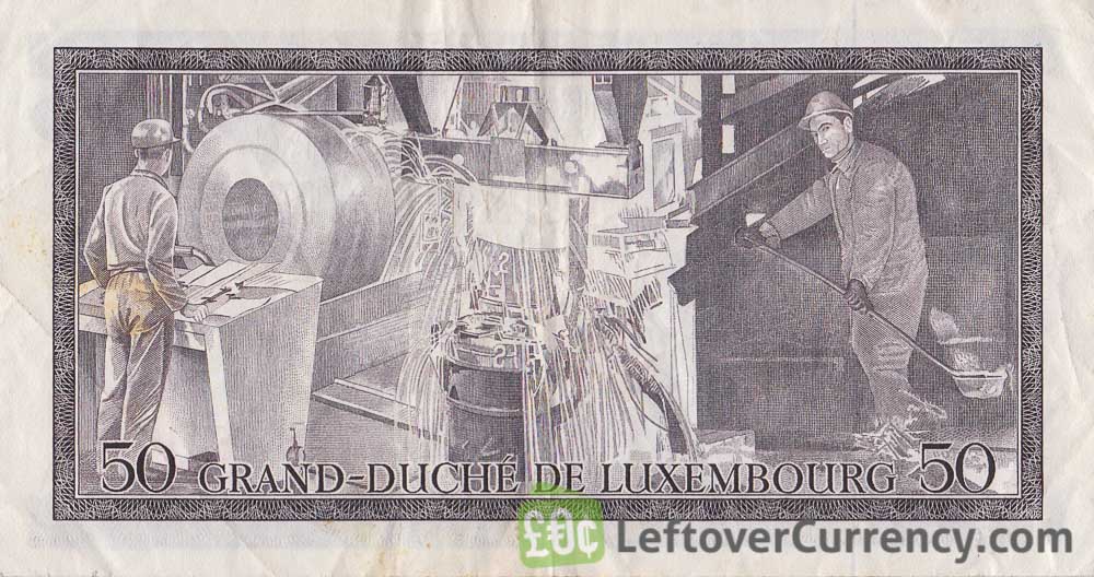 This brown coloured banknote of 50 Fr from Luxembourg has the portrait of Grand Duke Jean on the front side. The back side shows workers in a factory. Text on the note reads ‘Cinquante Francs’.