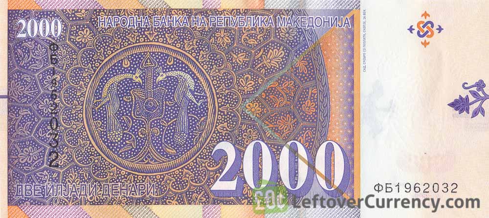 The yellow and purple coloured banknote of 2000 Macedonian denari shows a woman dressed in a traditional Macedonian bridal gown. On the back side of the 2000 MKD bill are two peacocks, also known as birds of paradise.