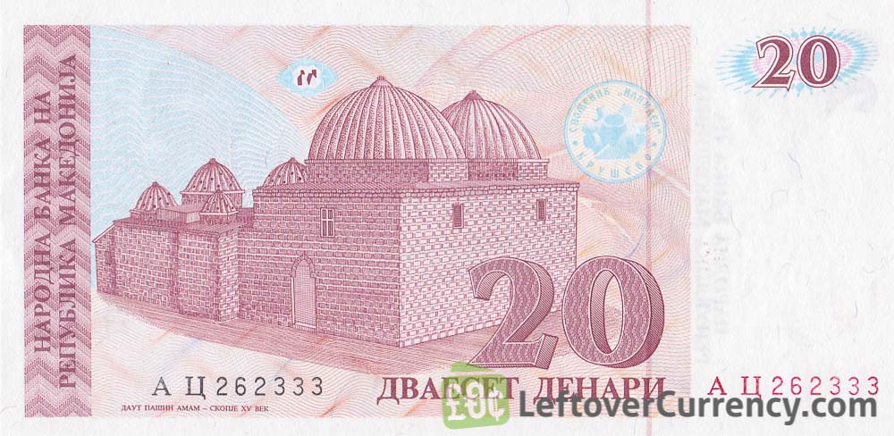 On the front of the 20 Macedonian denari banknote from 1993 is the 15th Century Turkish bath house ‘Daut Pasha Hammam’, located in Macedonia’s capital Skopje. On the back side of the 20 denari note is the clock tower of Sultan Murad Hjunkjar Mosque in Skopje.