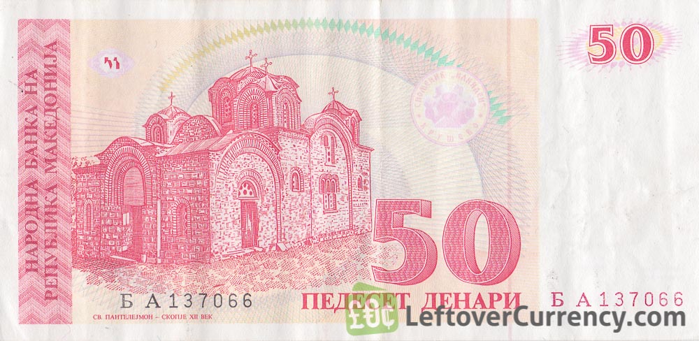 The banknote of 50 Macedonian denari from 1993 has an image of the The Church of St. Panteleimon in Gorno Nerezi on the front. The back side features the building of the National Bank of the Republic of Macedonia.