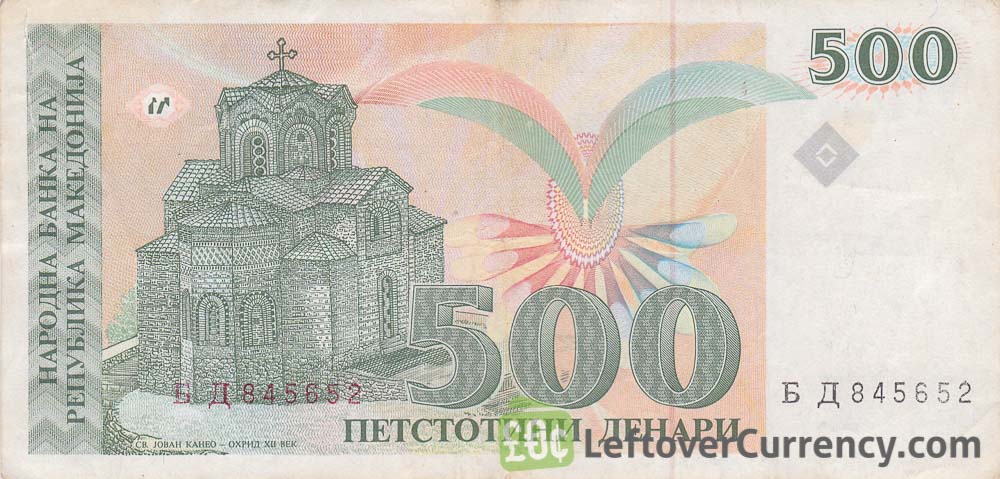 The banknote of 500 Macedonian denari from 1993 depicts a number of buildings in the city of Ohrid: The Church of St. John and the ruins of Ohrid Castle.