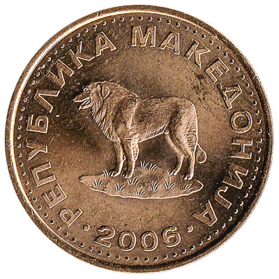 The coin of 1 Macedonian denar features a Yugoslavian shepherd dog, known to fight off wolfs, lynxes and even bears. On the front side of the 1 denar piece are the sun’s rays as on the flag of the Republic of Macedonia.