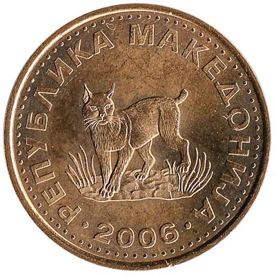 The animal on the coin of 5 Macedonian denari is a Balkan lynx. The 5 denar gold coloured piece weighs 6.6 grams and measures 27.5mm in diameter.