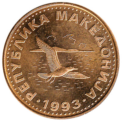 The coin of 50 deni from Macedonia is the equivalent of 0.50 Macedonian denari. The flying bird depicted on the coin is a seagull. The 50 deni piece weighs 4.1 grams and measures 21.5mm across.