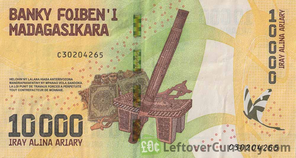 The obverse of this 10,000 Malagasy Ariary banknote features the Port of Ehoala and a turtle. The reverse of the 10,000 Ar note depicts a Valiha, a Madagascan instrument, and products carved into wood by the Zafimaniry, a sub-group of the Betsileo ethnic group of Madagascar. Text on the 10,000 MGA bill reads “Iray Alina Ariary”.