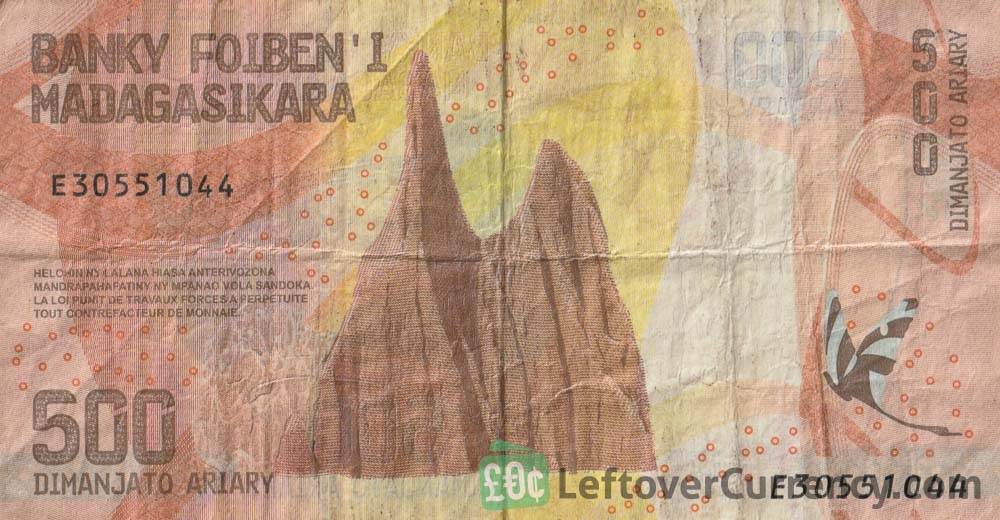 The Royal Hill of Ambohimanga is featured on the obverse of this 500 Malagasy Ariary note. The back of this 500 Ar banknote depicts the Tsingy Rouge Stone formation in the region of Diana and a comet moth. Text on the 500 MGA bill reads “Dimanjato Ariary”.