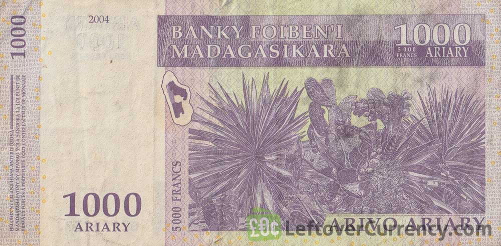 - Text: Ariary, Arivo Ariary, Banky Foiben'I Madagasikara, Le Gouverneur, 1000, 2004, 5000 Francs