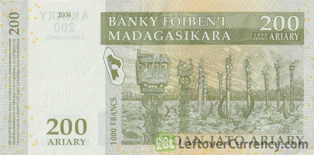 A thatch-roofed gateway to a village and highland houses is featured on the front of this 200 MGA bill. The back of the 200 Malagasy Ariary note depicts Madagascar-carved funeral posts with zebu skulls on the graves.