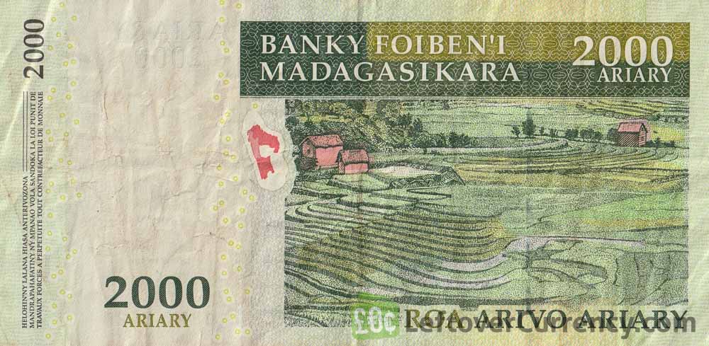 The Central Bank of Madagascar issued Malagasy Ariary banknotes in 8 different denominations, including this 2000 Malagasy Ariary banknote (Baobab trees). They are part of the demonetised Malagasy Ariary banknotes series. The Central Bank of Madagascar started issuing these 2000 Malagasy Ariary banknotes in 2003. They were withdrawn from circulation in 2020.