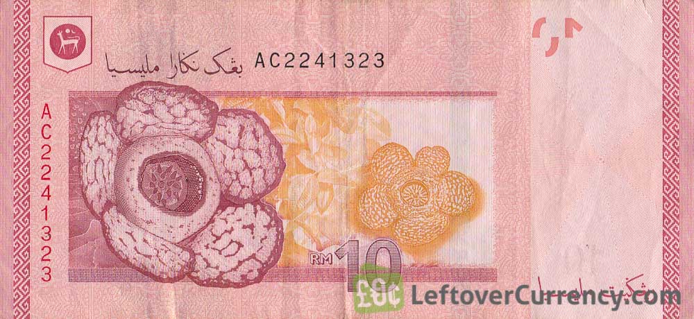 The 10 Malaysian Ringgit banknote of the 4th series is made of paper and coloured red. The RM10 note features Malaysia’s First Supreme Head of State, Abdul Rahman of Negeri Sembilan, on the front side, and rafflesia parasitic flowering plants on the back side.