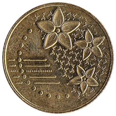 The 20 sen is made of nickel brass coin. One side has the denomination, date minted, the Hibiscus flower, and the text ‘Bank Negara Malaysia’, in common with all Third Series Malaysian coins. The other side has 14 dots representing the states and territories of Malaysia, and five horizontal lines symbolising the five principles of Rukunegara, the Malay national philosophy.