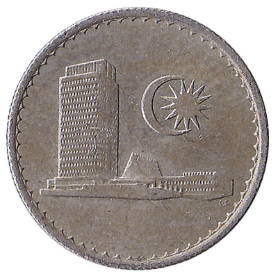 Malaysia’s first coins series included this coin of 5 sen, the equivalent of 0.05 Malaysian Ringgit. The modern style tower building on the cupronickel 5 sen piece is Malaysia’s House of Parliament in Kuala Lumpur