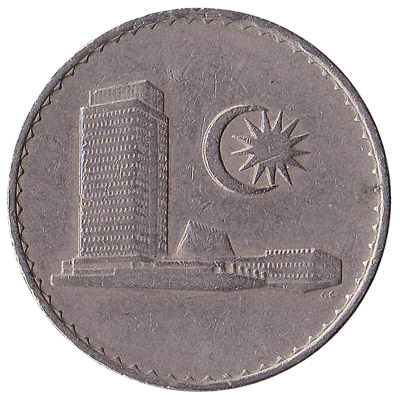 The 50 sen coin from Malaysia’s first coinage series has the Houses of Parliament on the back side, along with a 13-sided star and crescent moon. The cupronickel 50 sen piece weighs 9.33 grams and measures 27.7mm across.