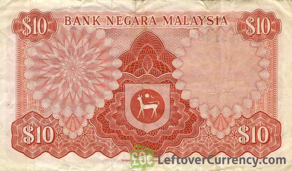 Malaysia’s First Series $10 Ringgit banknote is red coloured and decorated with geometrical patterns. The animal on the back side of the old RM10 bill is a barking dear, Malaysia’s national symbol.