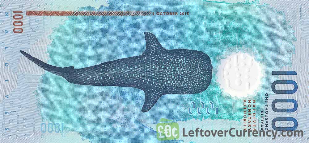 The blue coloured banknote of 1000 Maldivian Rufiyaa features sea life of the Maldives. On the front is a green marine turtle swimming in a coral reef. The back side of the 1000 MVR bill shows a whale shark.