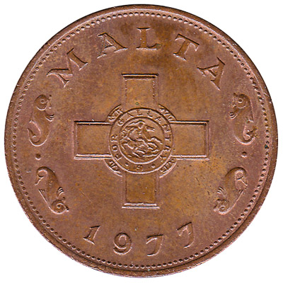 The Central Bank of Malta issued Maltese Lira coins in 10 different denominations, including this 1 cent coin Malta (large type). They are part of the Maltese Lira coins series. The Central Bank of Malta started issuing these 0.01 Maltese Lira coins in 1972. They were withdrawn from circulation in 1982.