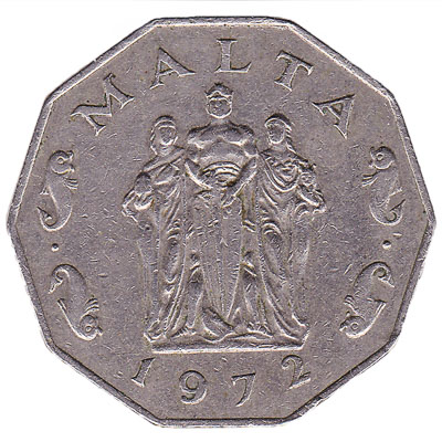 The Central Bank of Malta issued Maltese Lira coins in 10 different denominations, including this 50 cents coin Malta (large type). They are part of the Maltese Lira coins series. The Central Bank of Malta started issuing these 0.5 Maltese Lira coins in 1972. They were withdrawn from circulation in 1981.