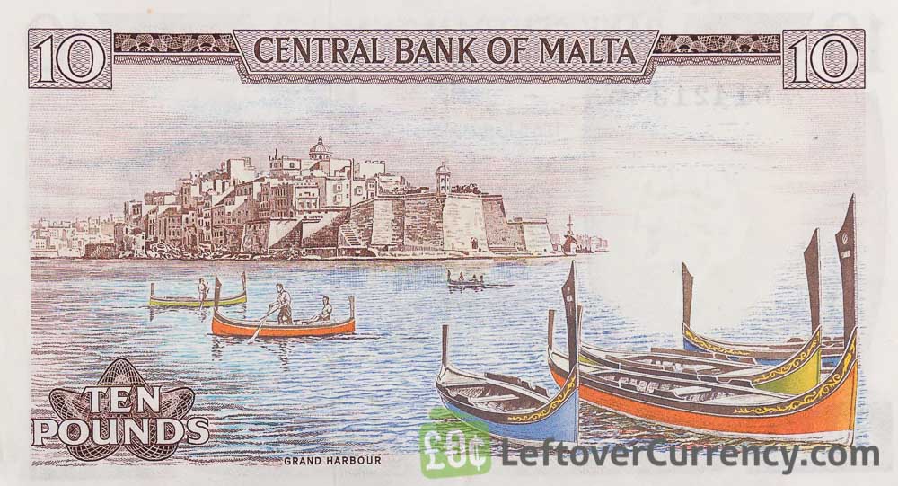 On the obverse side of the £10 Pounds banknote from Malta is a map of Malta and the Maltese coat of arms. On the reverse side of the Ten Maltese Pounds note is a view on Valletta’s Grand Harbour with boats.