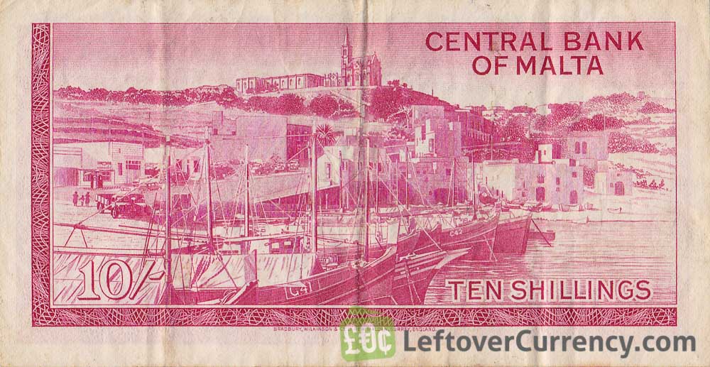 The banknote of 10 Shillings from Malta’s 1st series as an independent state has a value equivalent to 1/2 a pound. It features Queen Elizabeth II on the obverse side and a view on Mgarr Harbour in Gozo on the back side.