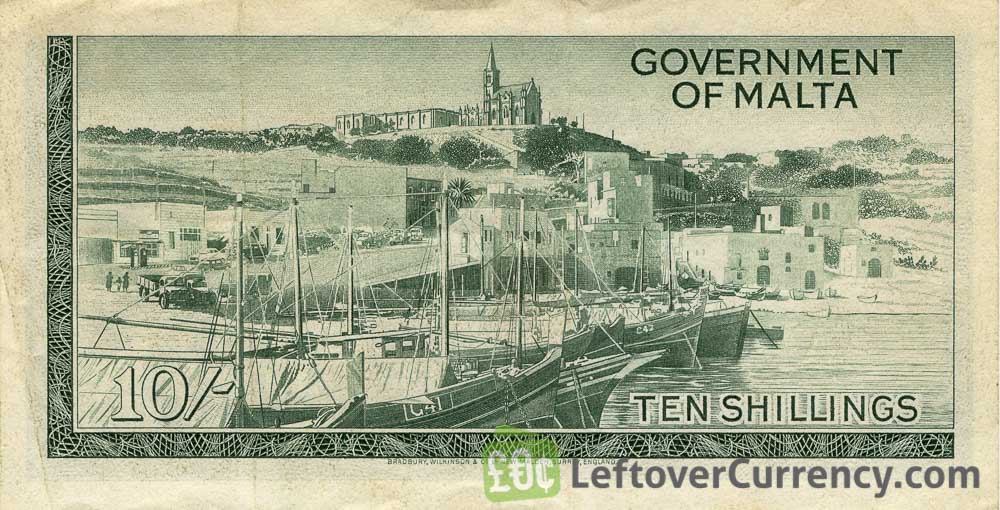 The 10/- banknote has the same value as half a pound. The 10 Shillings banknote from the Government of Malta features the portrait of Elizabeth II, Queen of Malta. The back side shows Mgarr Harbour in Gozo.