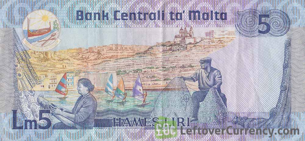 Hames Liri’ is Maltese for ‘Five Lira’. The blue-coloured Lm5 bill has the portrait of Malta’s first female president Agatha Barbara on the obverse side. The reverse side of the 5 Liri bill from Malta features a view on a harbour with a man making fishing pots, a woman making lace and four windsurfers.